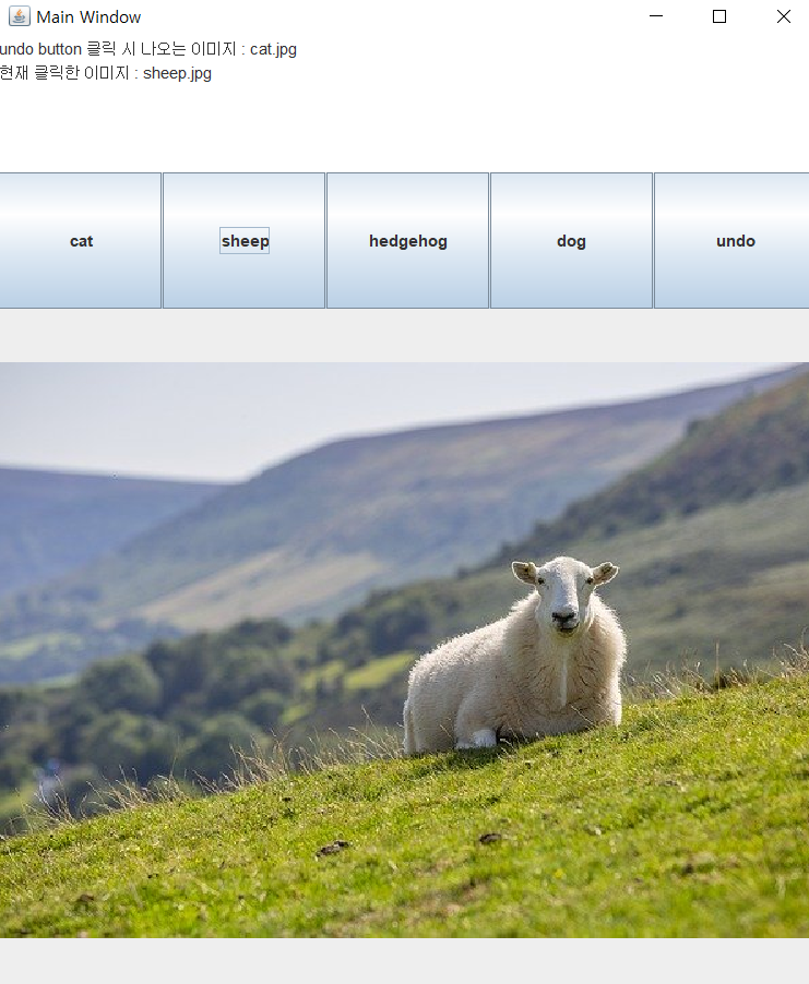 과제 : Command Pattern을 이용하여 버튼을 누르면 동물의 사진을 출력하는 프로그램을 개발하라, undo기능 추가